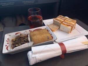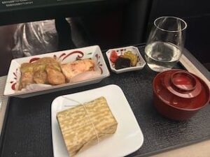 素晴らしいフルフラットシートでした、JAL万歳! 食事の画像はJALフライトで提供されたダイニングです。